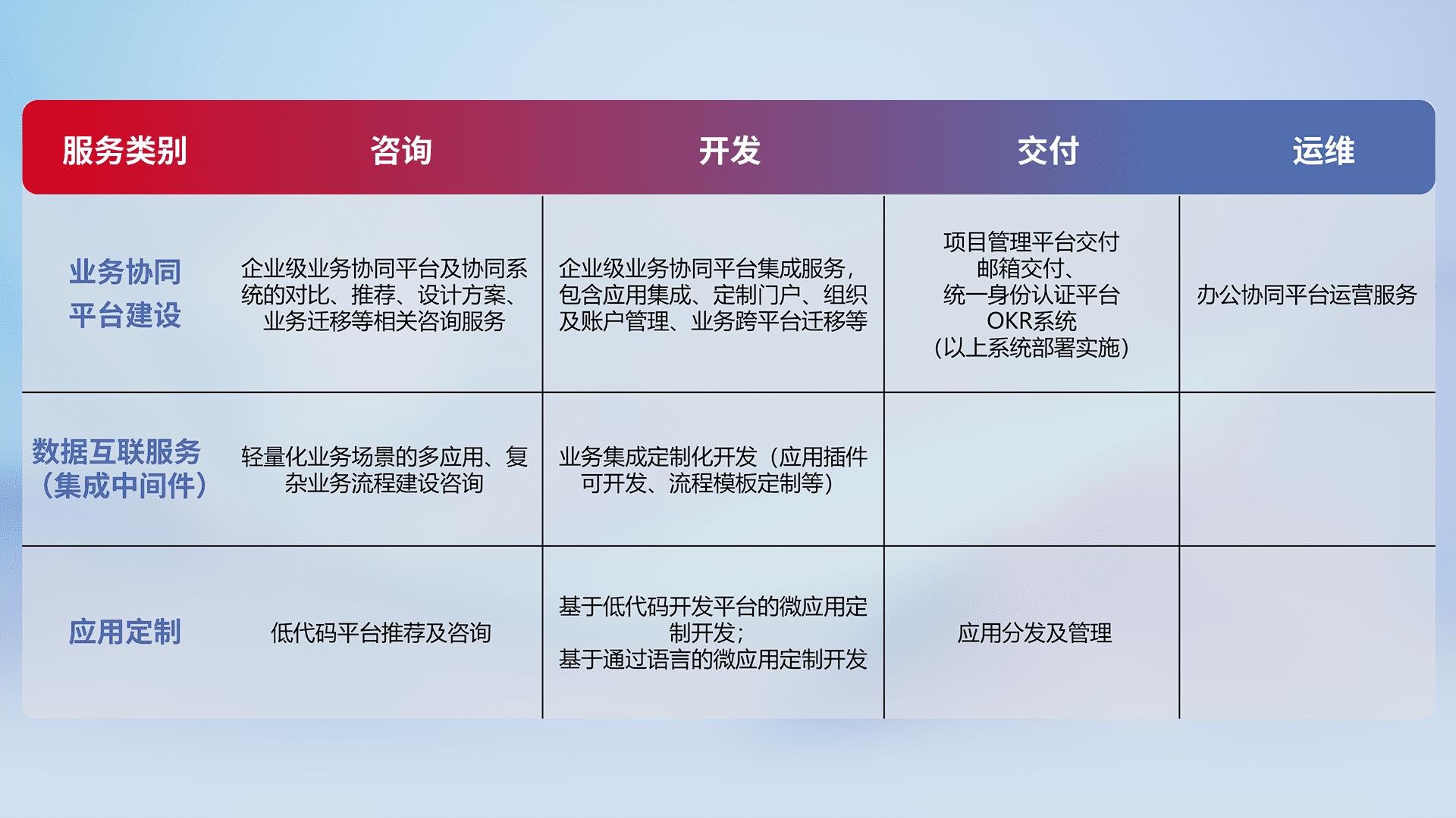 针对钉钉、、、、企微、、IDaas等平台级产品提供产品的规划、、、方案、、、、交付、、、、定制化开发等服务,,,,实现如统一协同办公、、、、智能客户服务、、、、混合会议管理、、、、智能数据查询、、、等业务场景,,实现数字化转型。。。